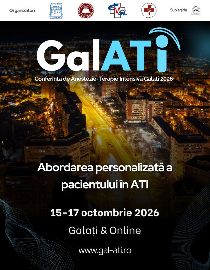 În acest context favorabil, avem deosebita plăcere de a anunța organizarea celei de-a treia ediții a Conferinței GalATI, care va avea loc în perioada 15–17 octombrie 2026, în format hibrid – onsite și online. Noua ediție își propune să continue tradiția excelenței științifice, oferind un program actualizat, axat pe noutăți, bune practici și soluții aplicabile în Anestezie și Terapie Intensivă.